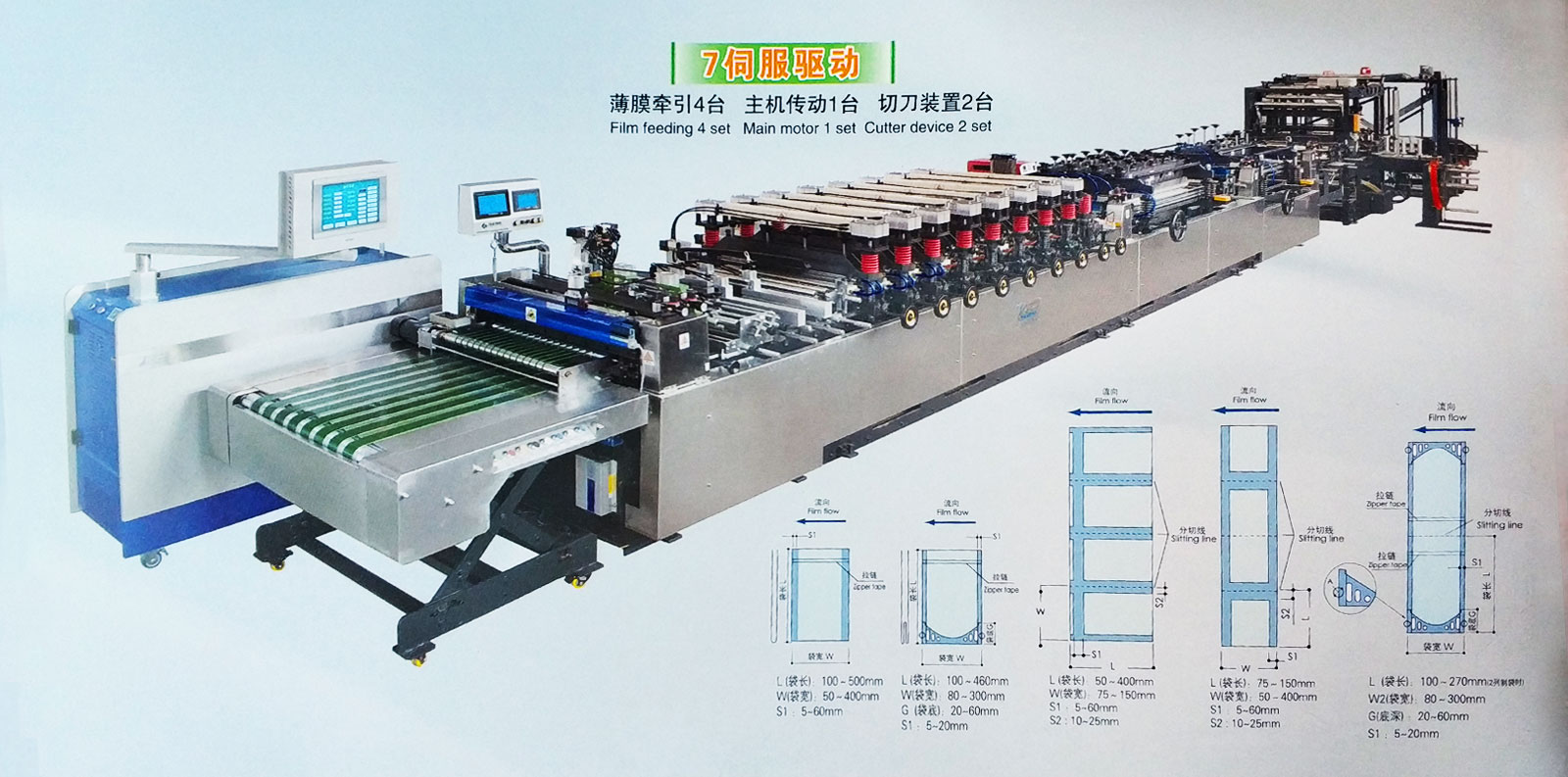 温 度:0-300°C可调,无触点自动控制,TFT显示 自动计数:可预置 成品输送:可预置输送量 打孔装置:可预置时间,并可设置连续,间隔 启动方式:可选用先烫压,后烫压 工作方式:印刷、无印刷、自立袋 倍送方式: 二至六倍送 长度测量:可进行色标间距离光电测量 选择:可进行选择送料不动,上下动作调节切刀 提示信息:光电丢失,温度挂失,放卷报警,伺服电机报警,张力报警,并自动停机